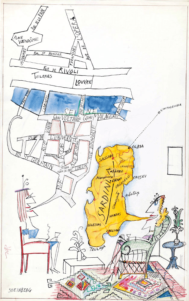 After the magazine’s legendary reader, “the little old lady in Dubuque,” enjoyed her moment of condescension with the cover, she and the rest of Steinberg’s viewers wanted to know why none of his typical landmarks were included to identify the grandeur for which the city is famous. He had a ready answer: this was a drawing of how “the crummy people”—that is, the working classes—see the world that lies beyond their immediate neighbourhood. He never intended to make people feel superior or even comfortable when they looked at this drawing, for his thoughts about America, particularly New York and its environs, had darkened considerably during the past decade.