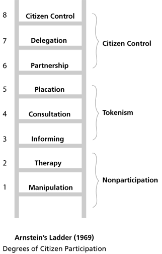 Alexander et al. state that in medieval times cities were “great communes, whose citizens were co-members, each with some say in the city’s destiny”. However, the 2 to 10 million population size they suggest is too large for direct democratic participation. In 1969, Sherry Arnstein introduced “A Ladder of Citizen Participation”. For a region of 2 to 10 million, it is hard to implement and shift from what Arnstein terms as “tokenism” towards “citizen control”.