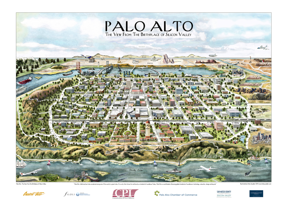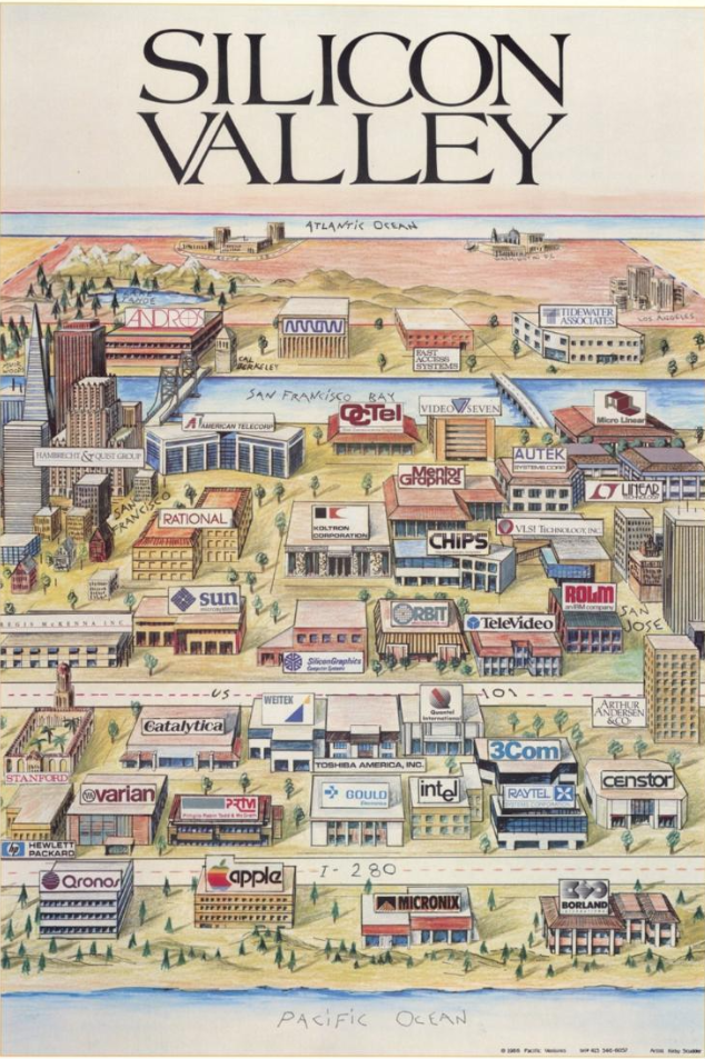 This cover has even been adapted by chambers of commerce globally to promote their cities and organisations. In David Rumsey’s blogpost of “25 Maps of Silicon Valley and Other Tech Hubs”, you can see the influence of Steinberg’s New Yorker cover, particularly Kirby Scudder’s 1986 homage, “Silicon Valley”. Heck, if you visit David Rumsey’s blogpost you can see the influences that led to the industrial map of Malaysia’s own Silicon Island, Penang.