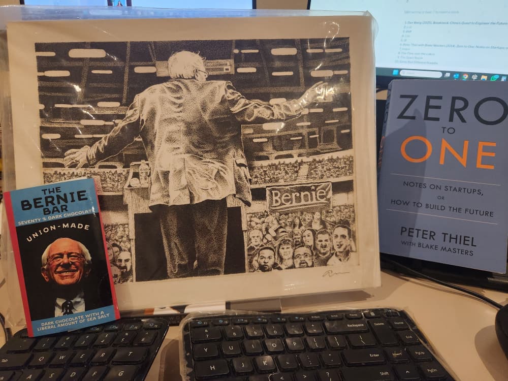 If all this makes you nauseous, I understand. You rail against tech bros and The Silicon Valley Canon. You are an AOC fanboy and love “Feeling the Bern” with Sanders (Bernie, not the Colonel, I might have to clarify for some readers). At the very least, you can venture into this book as a sociological excursion into the tech/startup bro milieu. And/or take up a spiritual challenge and accept that two opposites can be true at the same time. Here’s a photo of my desk right now as I type this – my copy of Zero to One next to an artwork of Bernie and a chocolate bar (dark chocolate with a liberal amount of sea salt!) I picked up in Burlington, Vermont several years back.